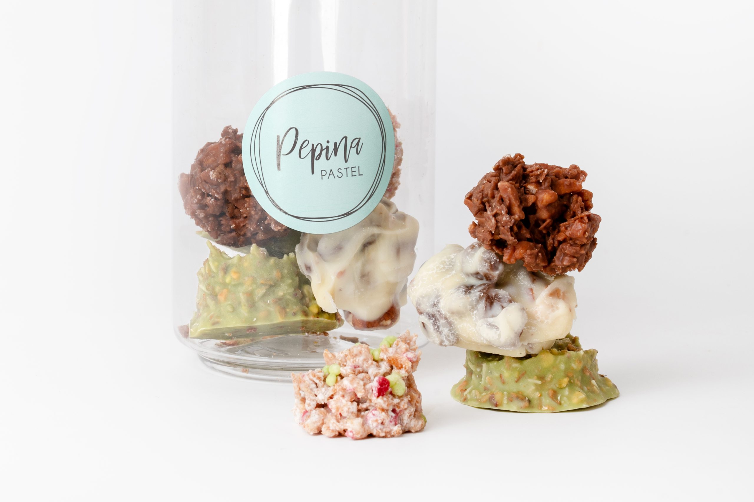 Bolsita de 4 rocas indivisibles elaboradas con chocolate blanco, pasas y avellanas.