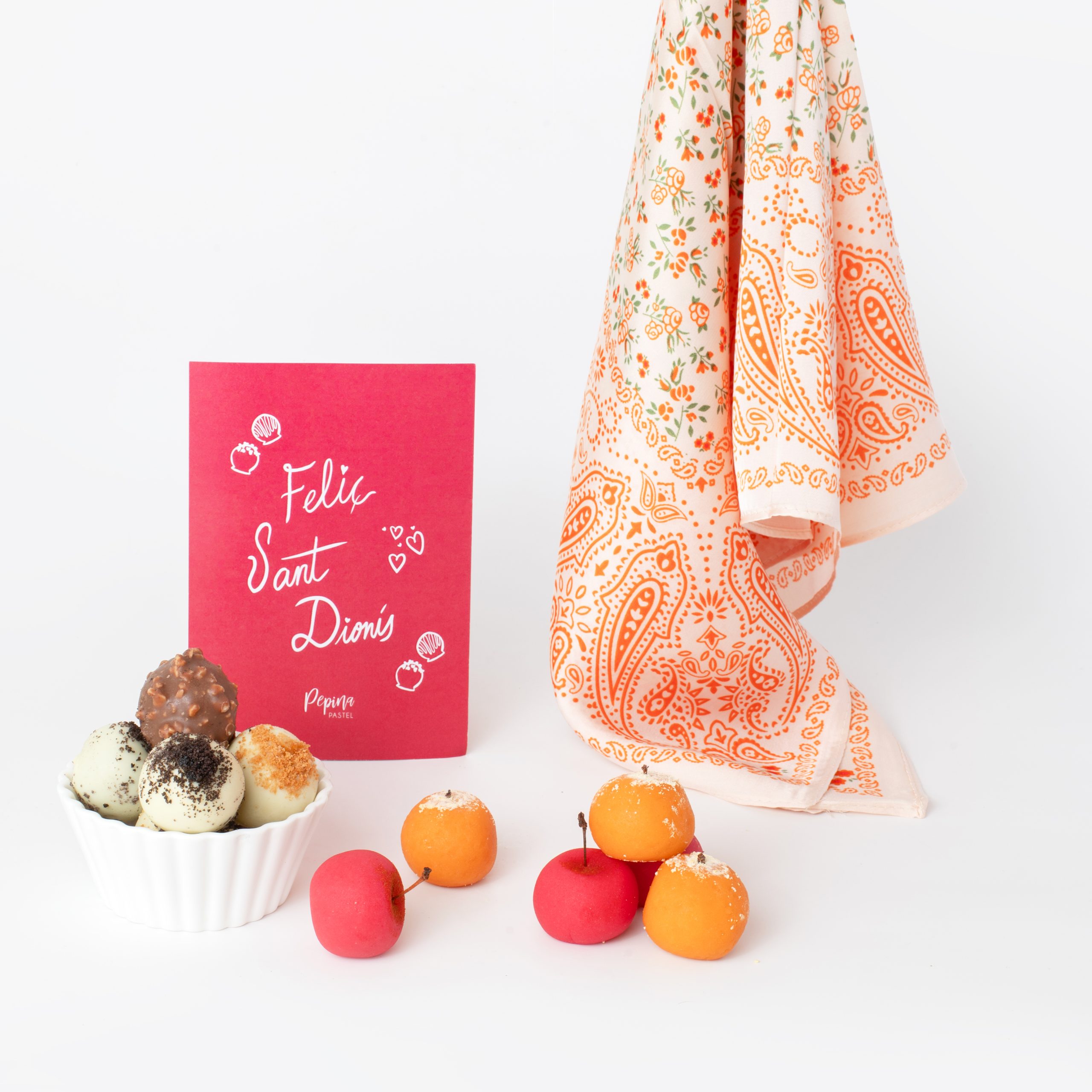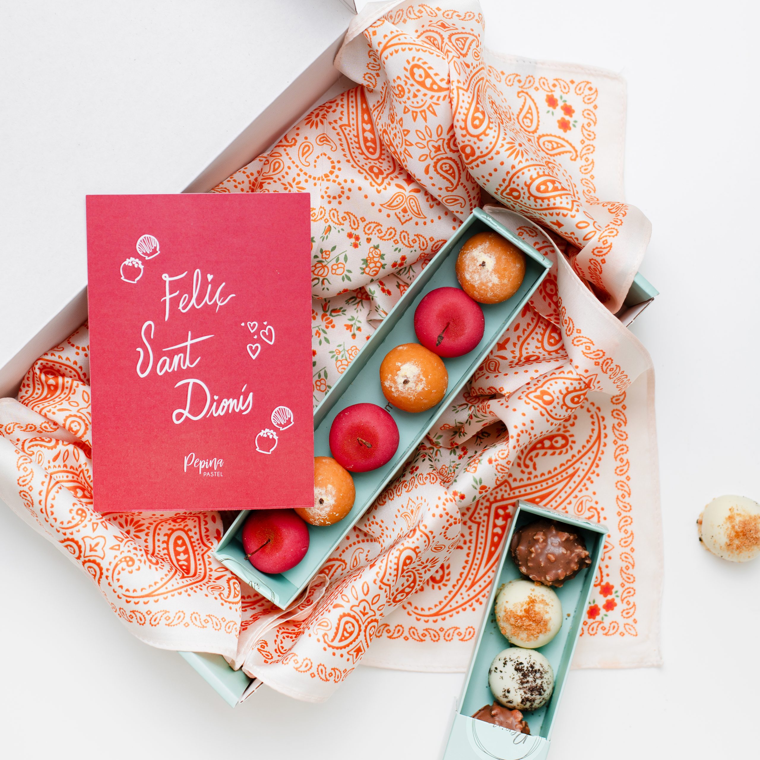 Cada mocadora incluye seis frutas de mazapán, seis pepibooms variados, un pañuelo exclusivo y una tarjeta con el mensaje “Feliç Sant Dionís ❤️”.