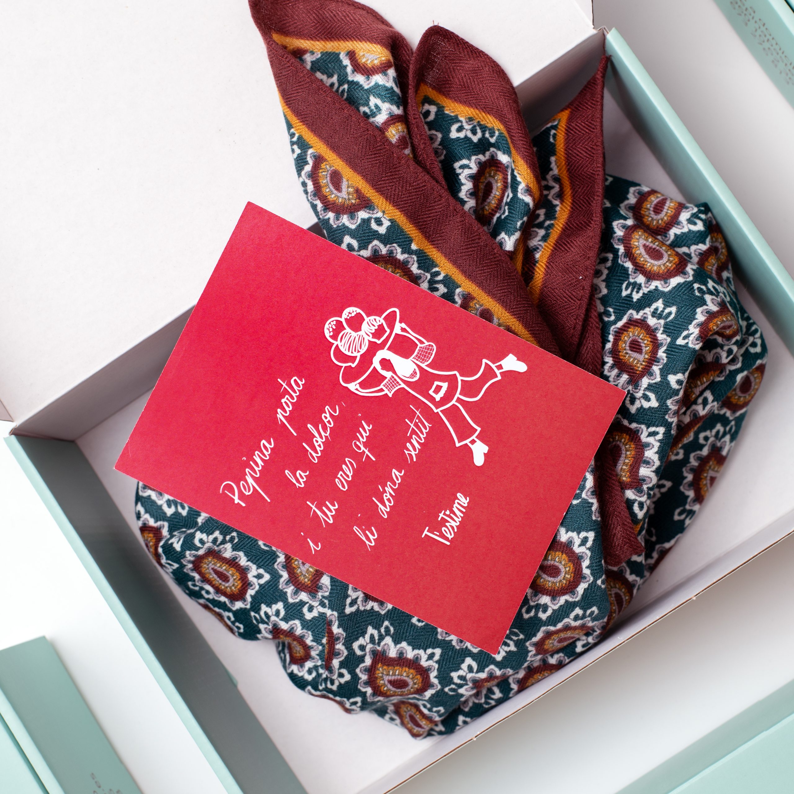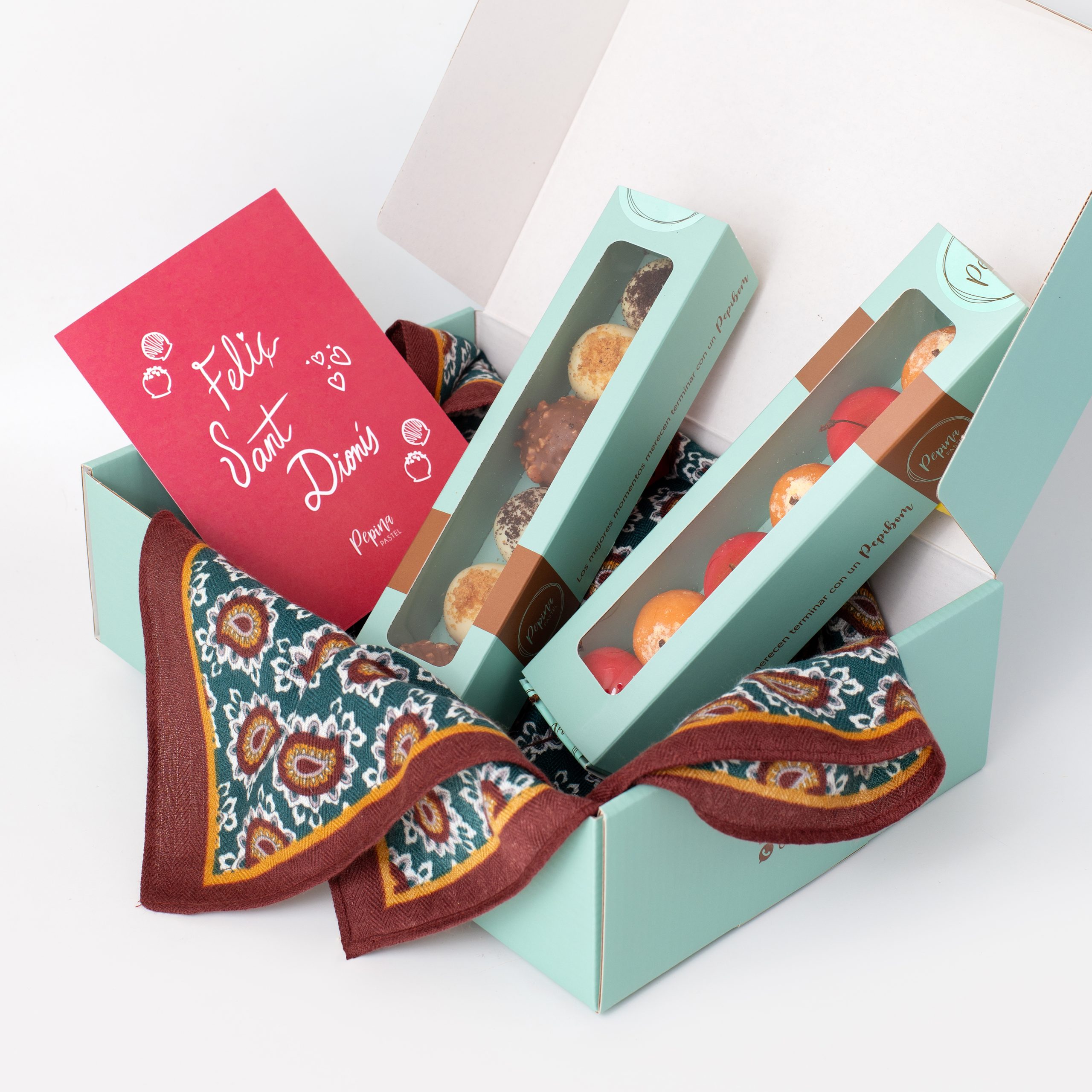 Nuestra mocadora incluye mazapanes artesanales, pepibooms variados y un pañuelo exclusivo que convierte cada regalo en algo diferente y personal.