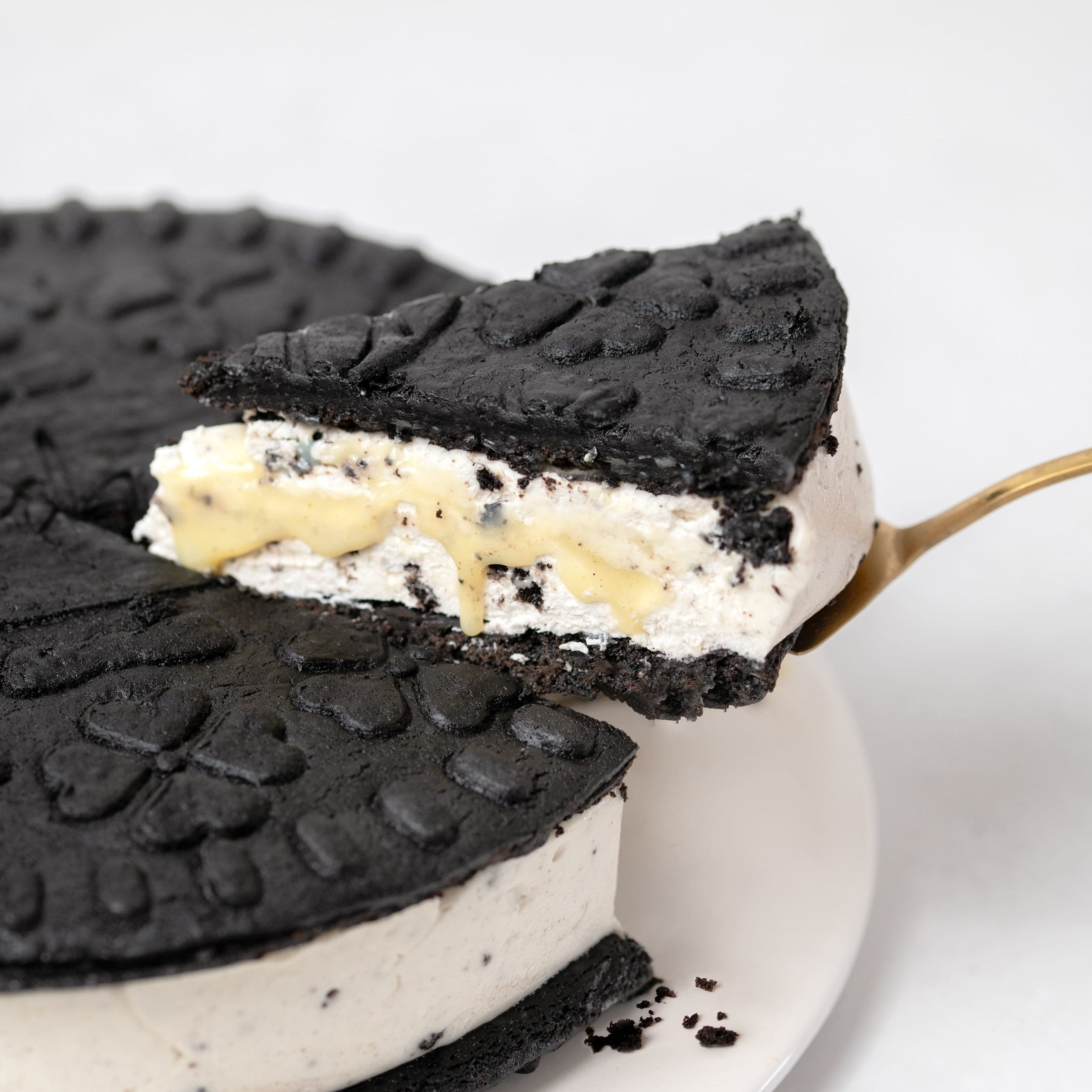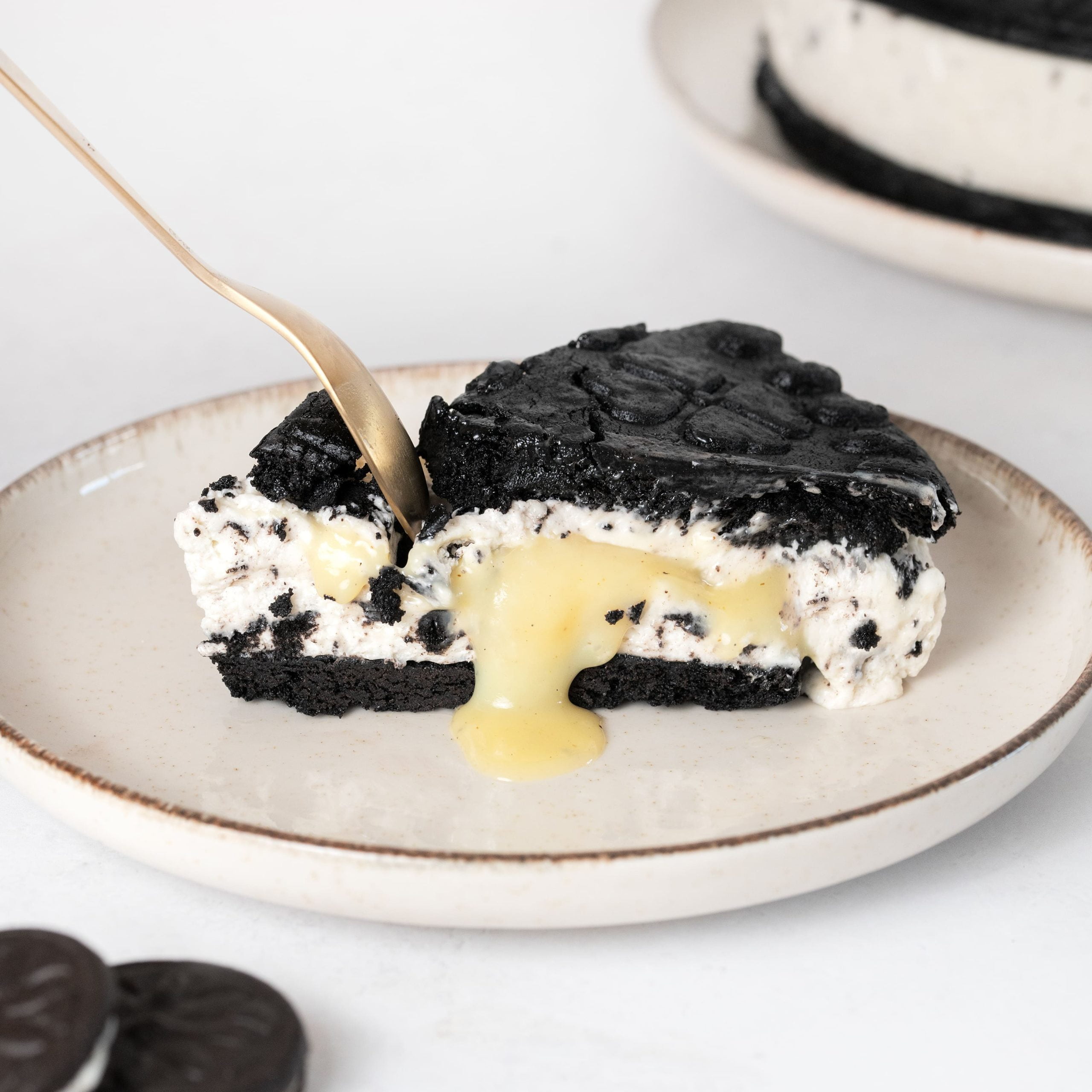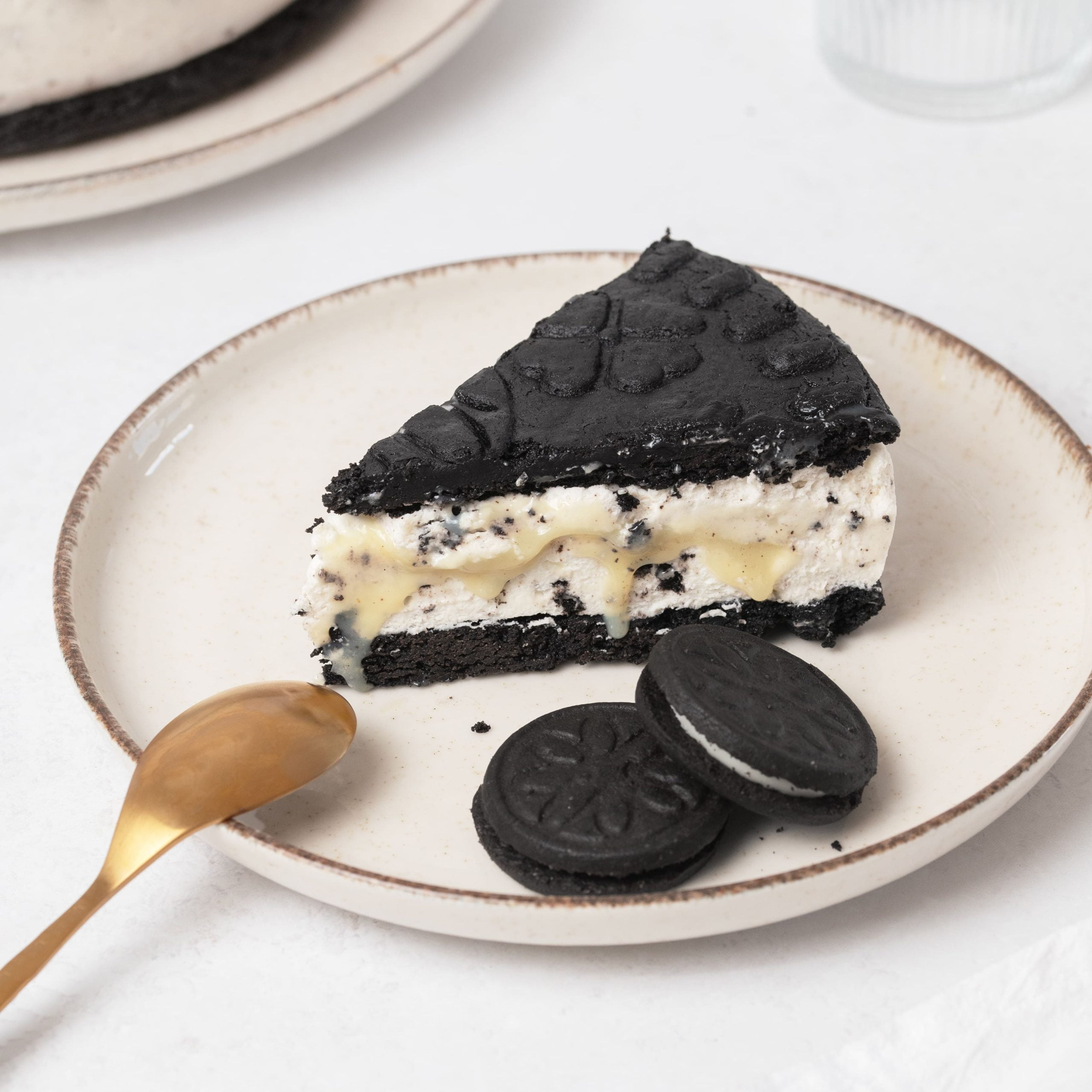 La tarta de cookies and cream tiene un sabor rico y chocolatoso, similar al de una galleta tipo oreo pero en una versión más suave y esponjosa. El relleno de vainilla y las galletas trituradas le añaden una cremosidad irresistible, haciendo de cada bocado una experiencia deliciosa y nostálgica.